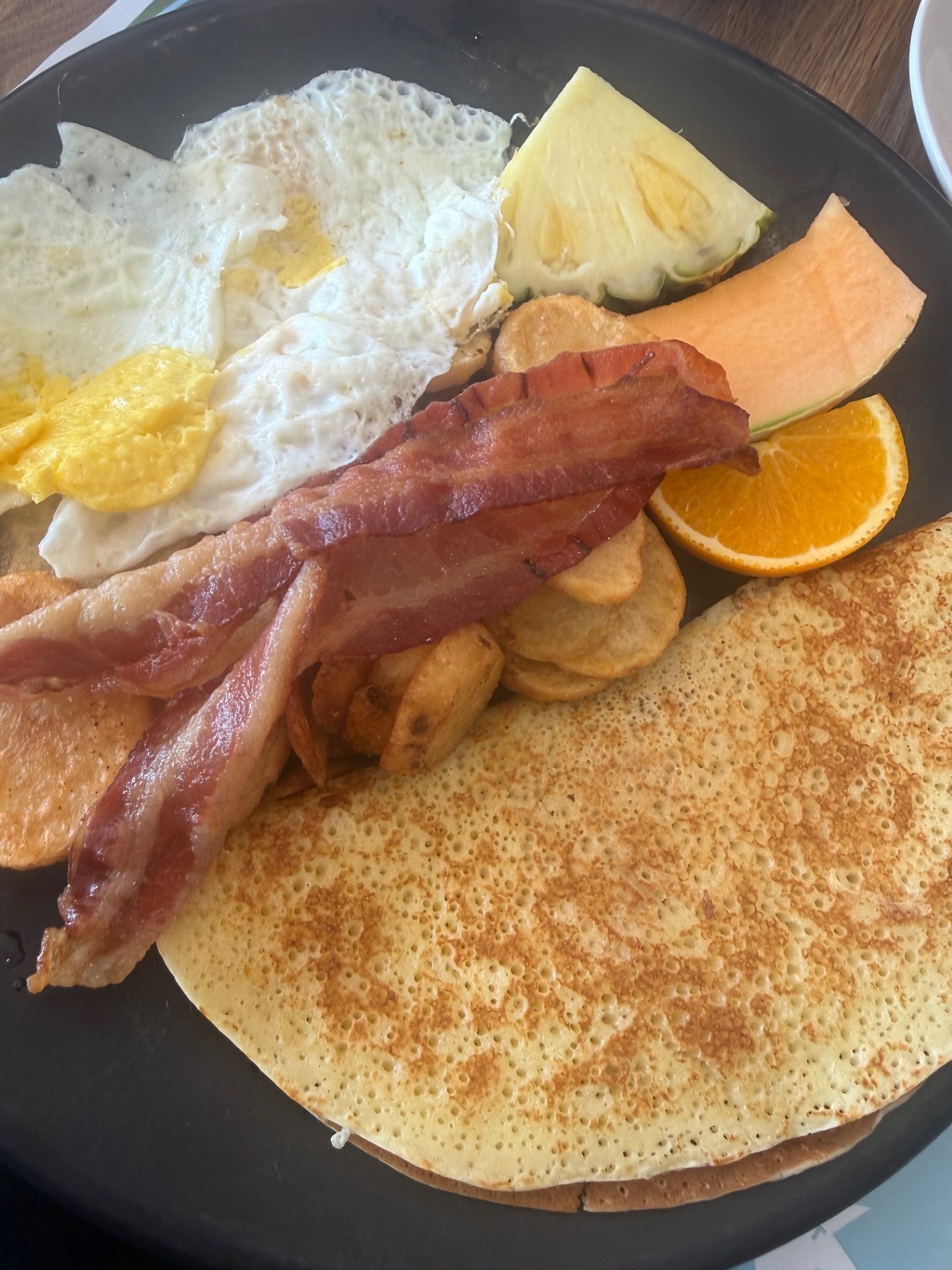 I slept in again and started my day at Eggsquis for some Eggs, Bacon, Fruit and a Ham and Swiss Crepe with Coffee. It was very filling!
